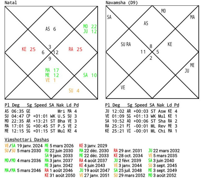 Dans certains cas difficiles, les bilans Ayurvédiques peuvent éventuellement être complétés d’une étude en Astrologie Jyotish pour mieux comprendre des problématiques complexes. Il ne s’agit pas de prédictions mais de donner un éclairage sur l’influence des astres et des planètes sur notre santé et notre Vie en général. Cette méthode permet d’expliquer les forces et les faiblesses. Elle donne aussi des solutions concrètes pour renforcer les influences positives, bénéfiques des planètes et pour pacifier les influences négatives sans pour autant changer le destin de l’individu.
